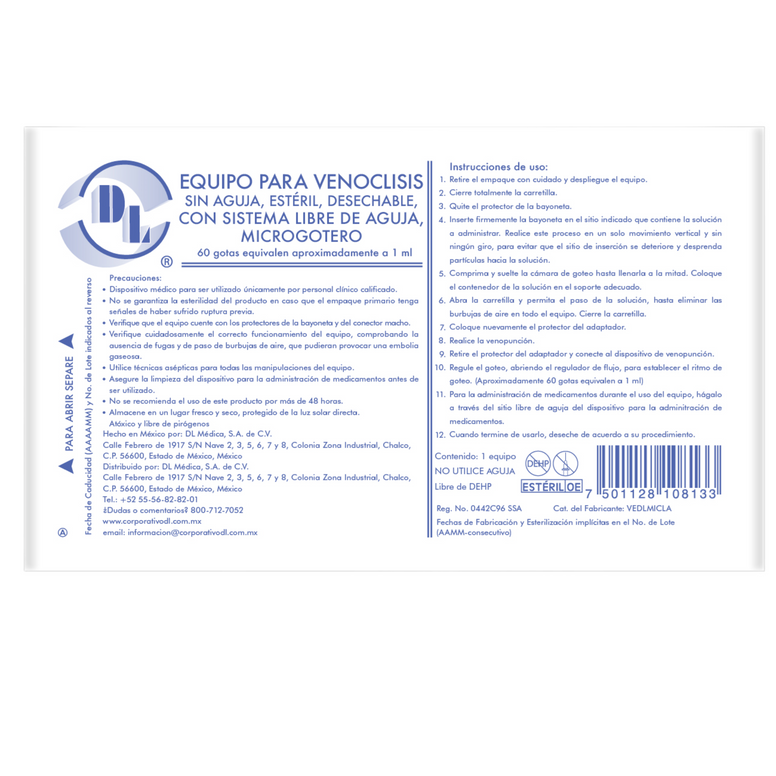 Equipo para venoclisis, sin aguja, estéril, desechable, con sistema libre de aguja, Microgotero