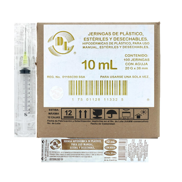 Jeringas DL 10ml 20g x 38mm caja con 100 piezas, estériles y desechables.