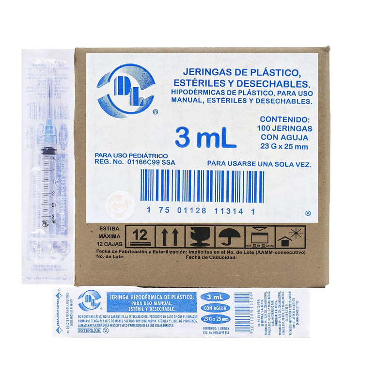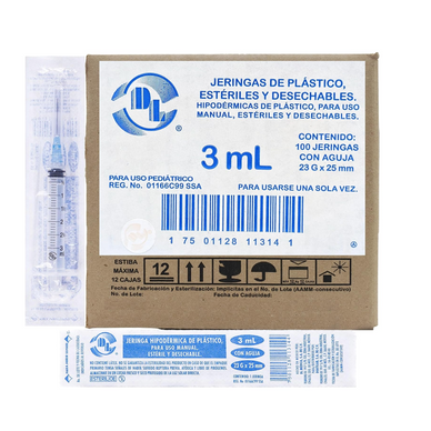 Jeringas DL 3ml 23G x 25mm caja con 100 piezas, estériles y desechables.
