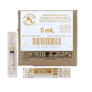 Jeringas DL 5ml 20G x 32mm caja con 100 piezas, estériles y desechables.