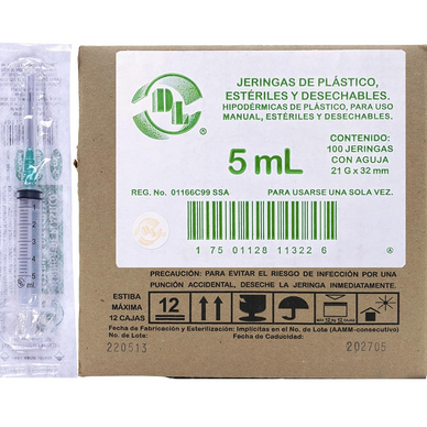 Jeringas DL 5ml 21G x 32mm caja con 100 piezas, estériles y desechables.