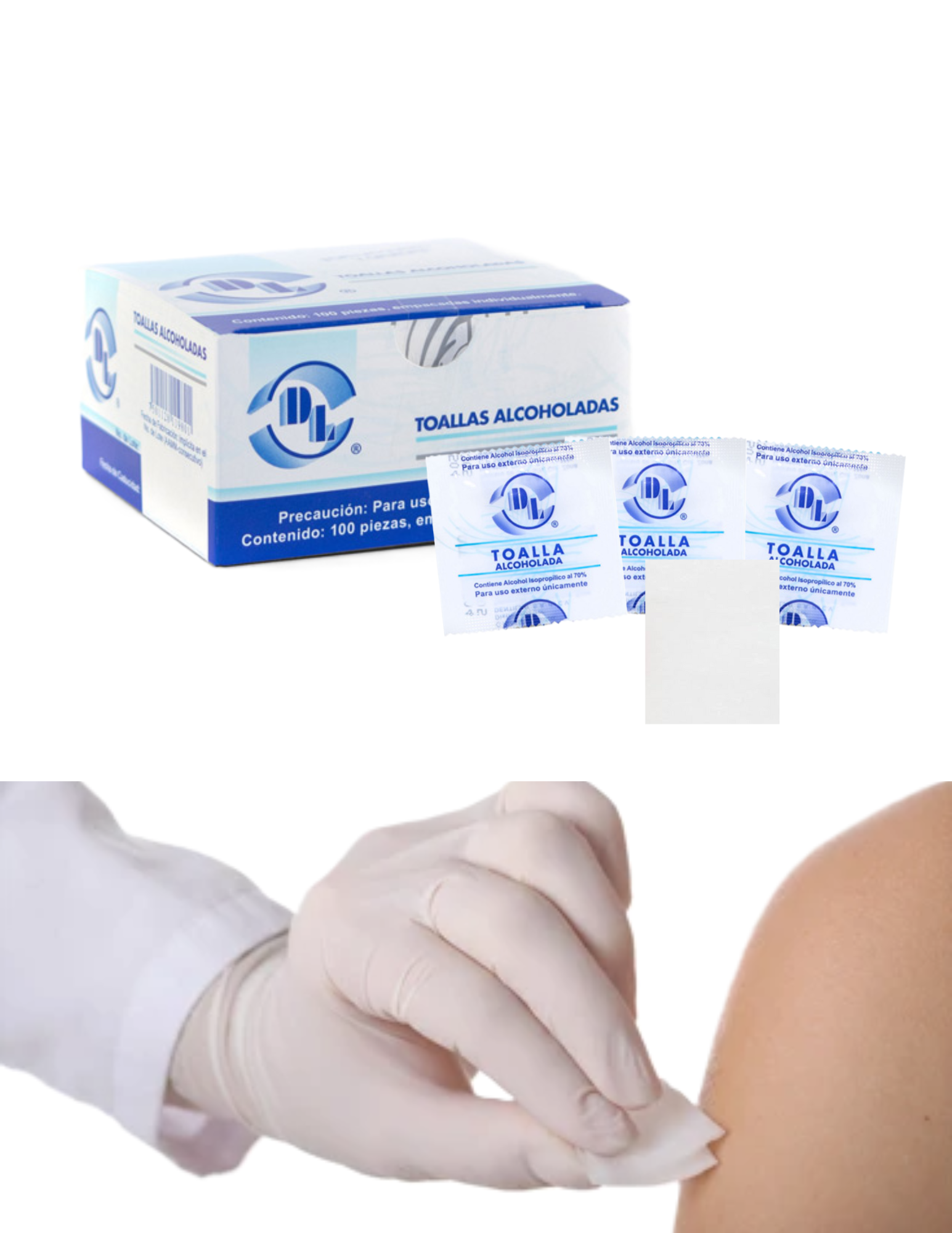 DL Toallas alcoholadas suaves y resistentes con alcohol isopropílico al 70%. Caja con 100 sobres